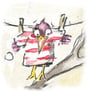 Ein Kind ,rot weiß gestreift, hängt fest,
