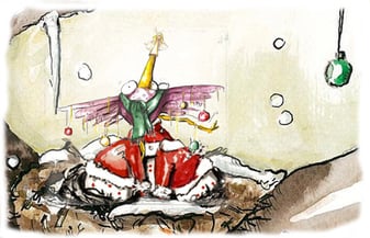 ein Vogel im roten Gewand, gütig und mit Geschenken allerhand,